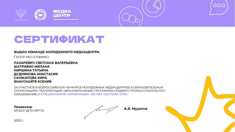 Представляете, на III Всероссийском конкурсе молодёжных медиацентров мы участвовали в номинации «85 лет системе СПО» и получили сертификат!